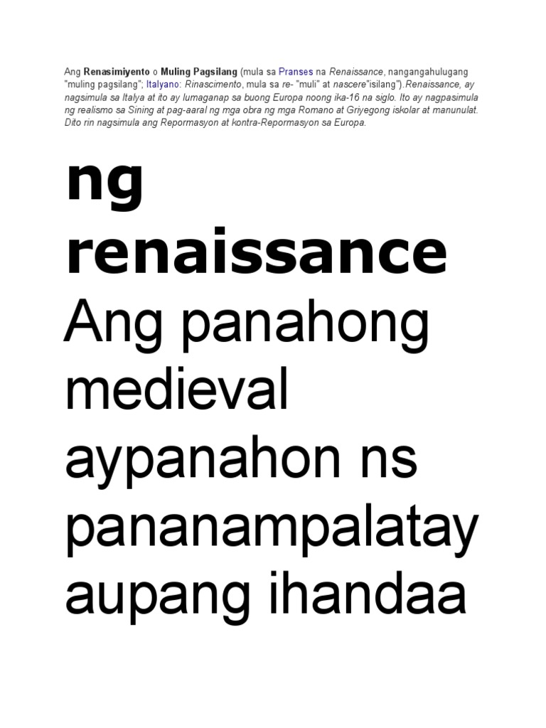Itoay naganap sa huling bahagi ng gitnang panahon at pagsulong ng makabagong panahon. Ang Renaissance ay salitang Pranses na ang ibig sabihin ay muling pagsilang. Ang Renaissance ay salitang Pranses na ang ibig sabihin ay.