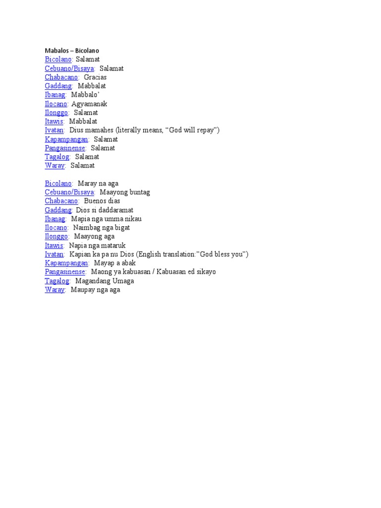 My name is ______ an ngaran ko. Dios marhay na aga saindo gabos. Maraming Salamat sa tulong in tagalog Margay na salamat sa imong tabang in bicolano.