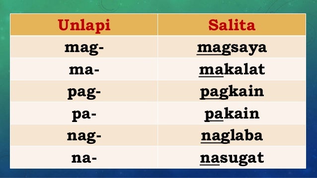 Ano ang salitang-ugat at panlapi at halimbawa nito. Um- ma- i- mag- ipa-. This 20-item worksheet instructs the student to identify the root word the affix attached to the root word and the type of affix used.