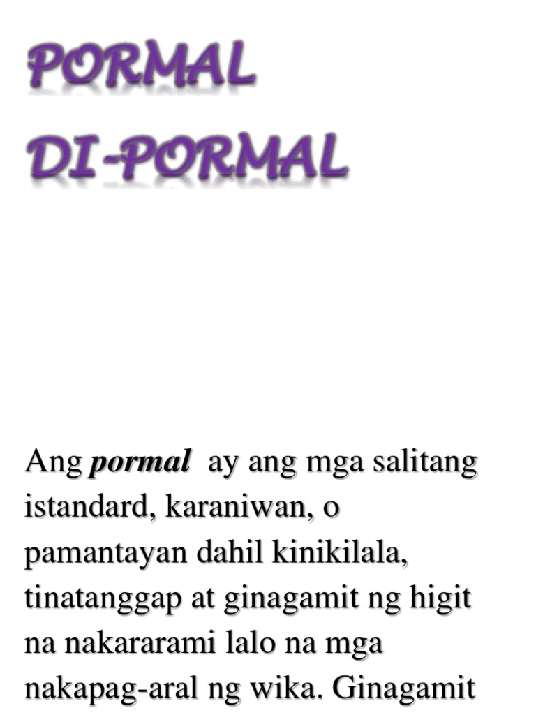 Pormal at di pormal na salita. Halimbawa ng pormal at di pormal na salita. Eto ang tatak ng pagka-Pinoy natin.